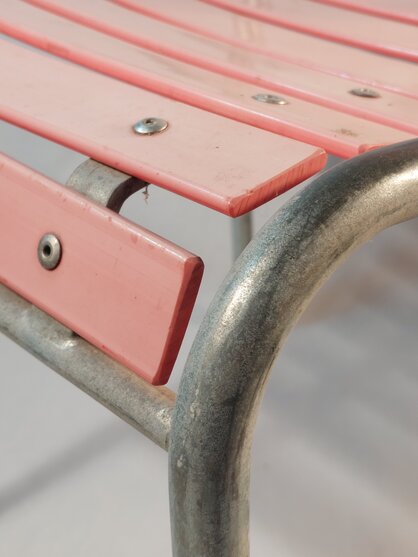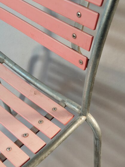 schöner gartenstuhl aus den 50erjahren, vorderseite schön abgeschossen zu einem fast gleichmässigen altrosa
