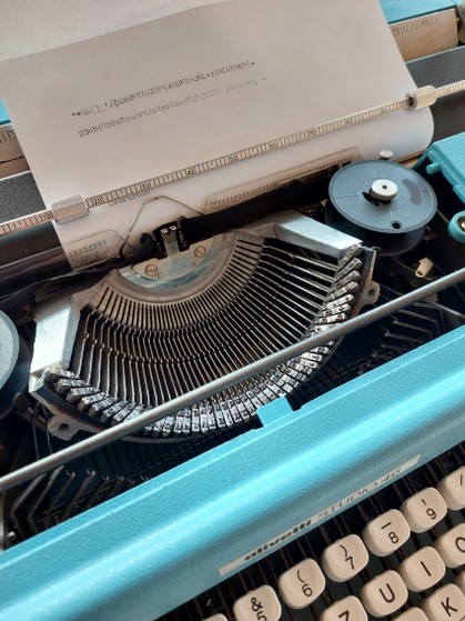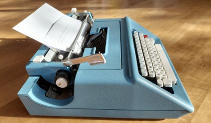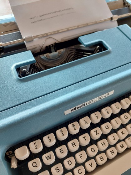 einer der klassiker aus dem hause olivetti - die studio 46 von mario bellini in aluguss, taubenblau, ausgezeichneter zustand, farbband etwas schwach (gibt in papeterien und im internet)