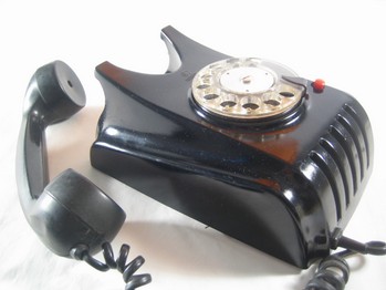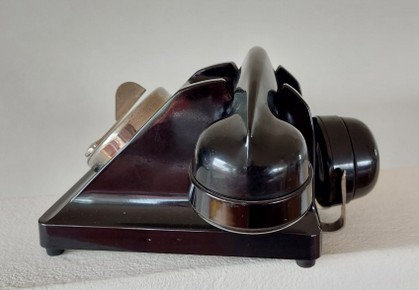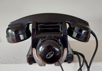 ein ziemlich schnittiges bakelittelefon aus frankreich, fünfziger jahre, vermutlich ericsson. mit separater zweitmuschel zum mithören oder beidohrigem hören.