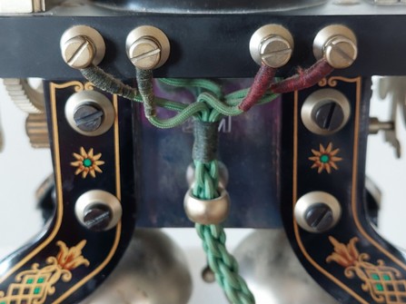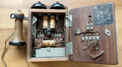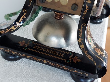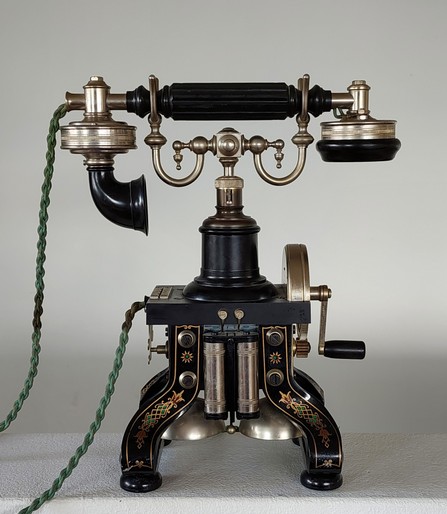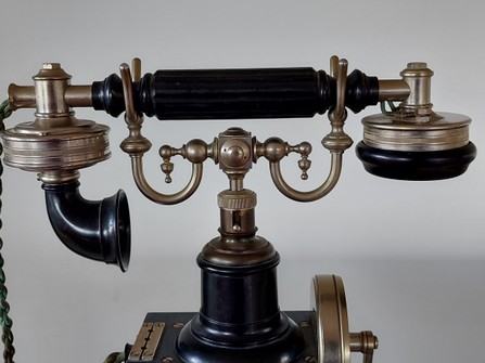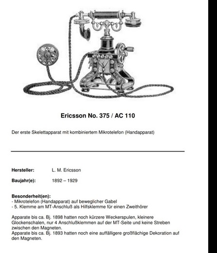 das wohl bekannteste tischtelefon aller zeiten: tischstation ericsson stockholm, modell 1892. produziert von 1892 bis 1929. dieses modell vor 1898, weil es noch keine streben zwischen den magneten aufweist und nur 4 klemmen hat.