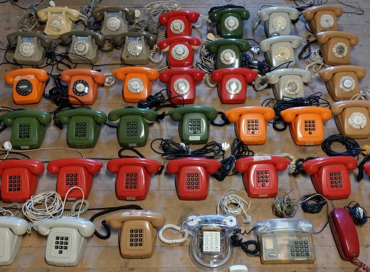 zahlreiche analoge wählscheiben- und tastentelefone in rot, orange, grün, grau, braun aus den 70erjahren