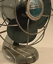 bläulicher tischventilator im art déco stil, vermutlich 50erjahre, marke handybreeze mit blauen blechfügeln