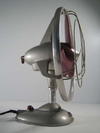 grosser und formschöner schweizer ventilator aus den 40erjahren. bordeauxrote bakelitflügel, metallgehäuse, kippbar und drehend