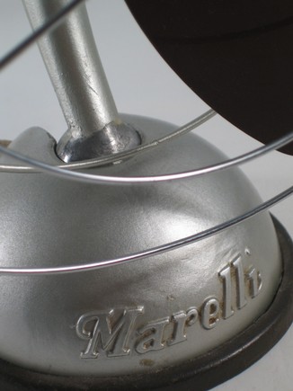 marelli milano, wahrscheinlich 50erjahre im streamline bzw art déco stil - neigbarer, grauer metall ventilator mit schutzgitter und hellgrünen rotorflügeln
