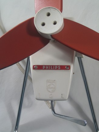 grau-weisser bakelit tischventilator marke philips mit roten gummiflügeln und stabschalter vorne