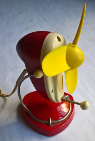 kleiner tisch- oder wandventilator aus rotem duroplast an chrombügelstand