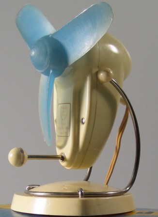 crèmeweisser bakelit tischventilator, auch für wandmontage, auf chromring kippbar, mit hellblauem kunststoffrotor